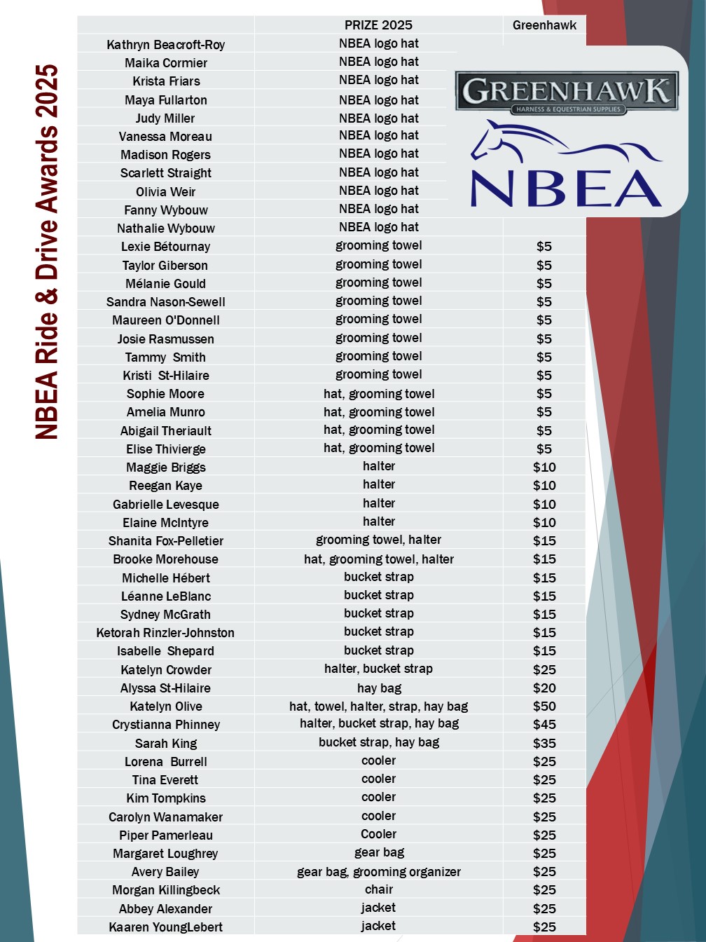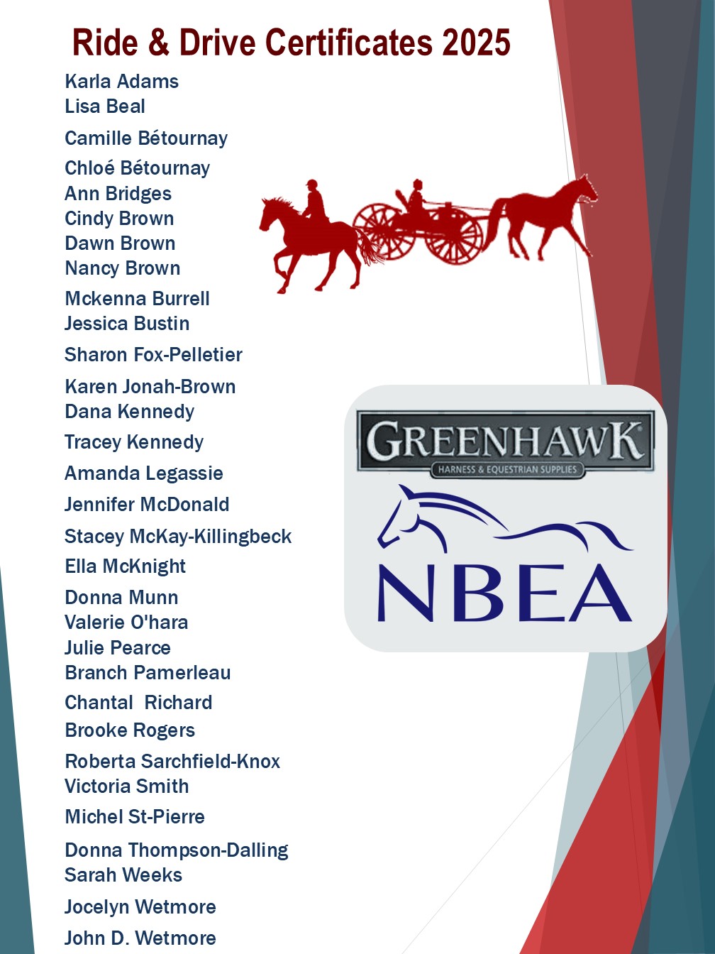 The New Brunswick Equestrian Association appreciates the support of New Brunswick Greenhawk as the sponsor of the "NB Greenhawk Ride & Drive" reward program for NBEA members.In the fall of 2009, NB Greenhawk approached the NBEA to see how they could assist in a program that would encourage individuals to spend more time with their equine partners. The NBEA Ride/Drive Program was a perfect fit. Sign up now and track the time spent with your horse for your chance to receive awards. |